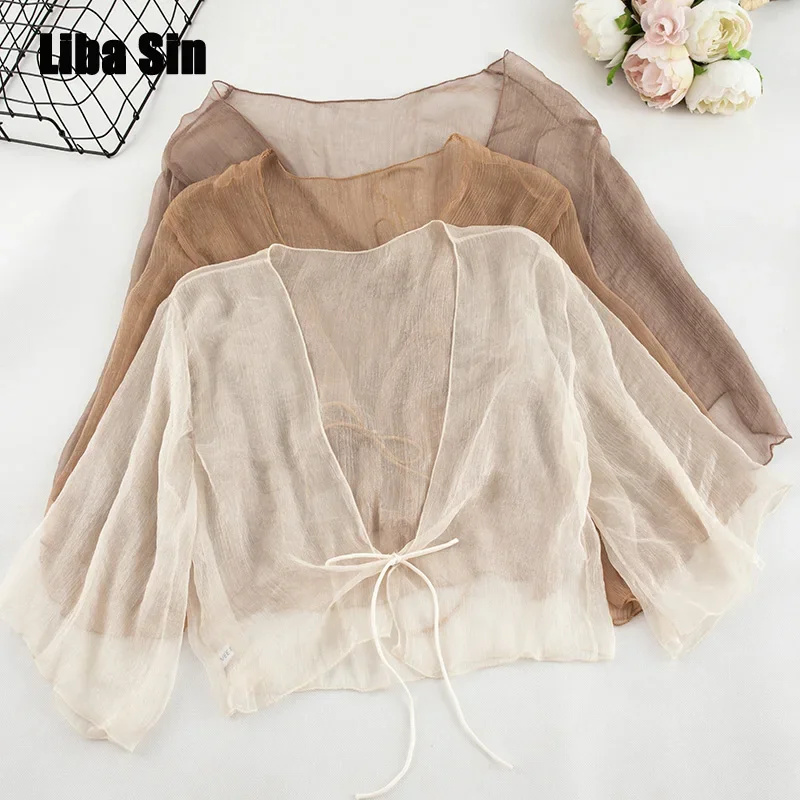 59سترة ليبا سين للنساء صيفية مجعدة من الشيفون شفافة غير رسمية على طراز هاواي شفافة من خلال الجزء العلوي الفضفاض الشفاف للعطلات