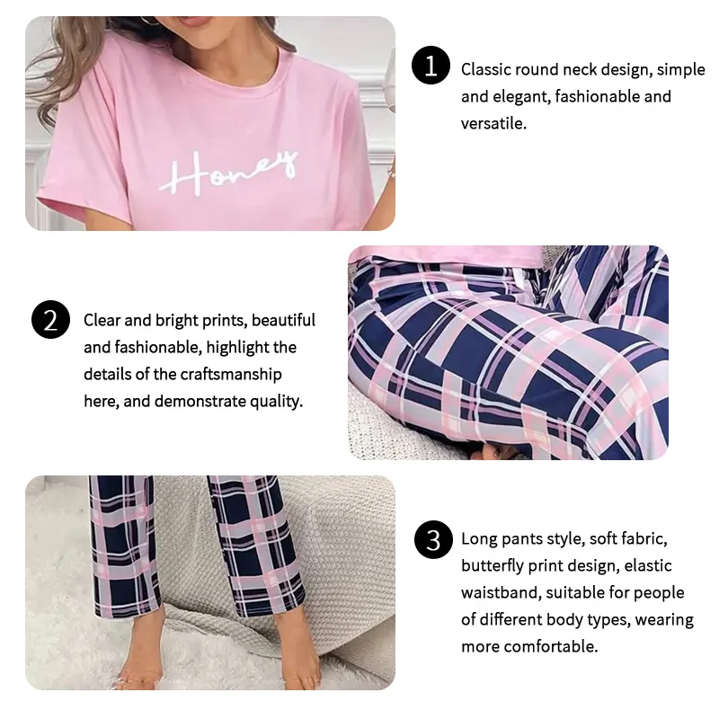 رقبة دائرية، أكمام قصيرة، طباعة مربعات، تي شيرت لطيف، حزام خصر مطاطي، سروال طويل، بيجامة 2 قطعة.