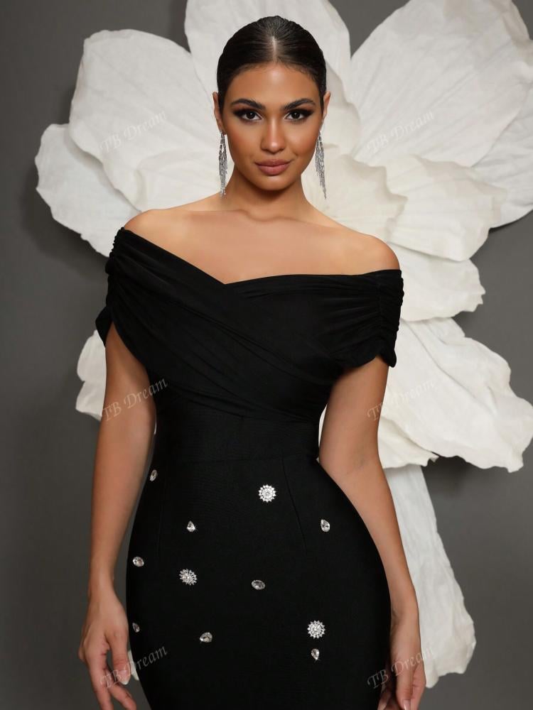 فستان حريري مزين بخرز يدوي على الكتف المكشوف، تصميمه الضيق المتموج يبرز جمال قوامك بأسلوب أنيق وجذاب، مثالي للسهرات والمناسبات الخاصة.