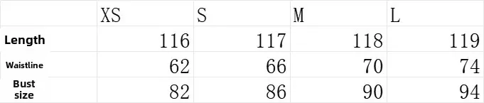 • XS: الصدر 82 سم – الخصر 62 سم – الطول 116 سم.